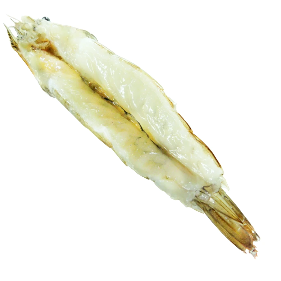 Se hace un corte profundo desde la cabeza del camarón hasta el final del torso dejando intacta la cola, se retira la vena. Finalmente es congelado para su exportación.