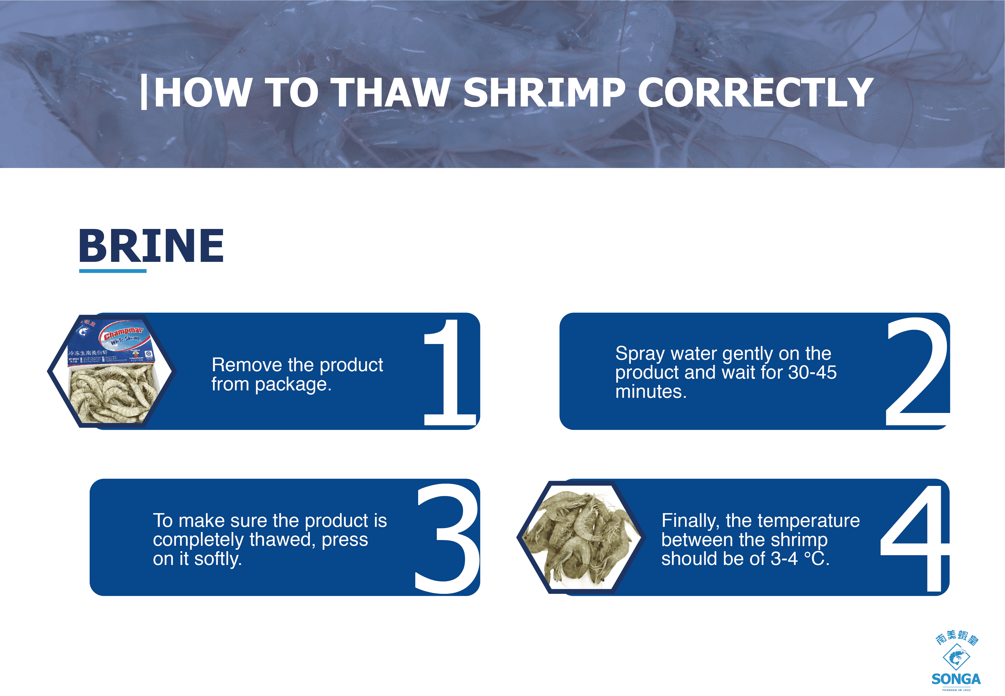 Our shrimp is professionally and technically harvested and transported to the processing plant in isothermal bins that allow the shrimp to be kept at 4 degrees Celsius or less while maintaining its freshness and quality.